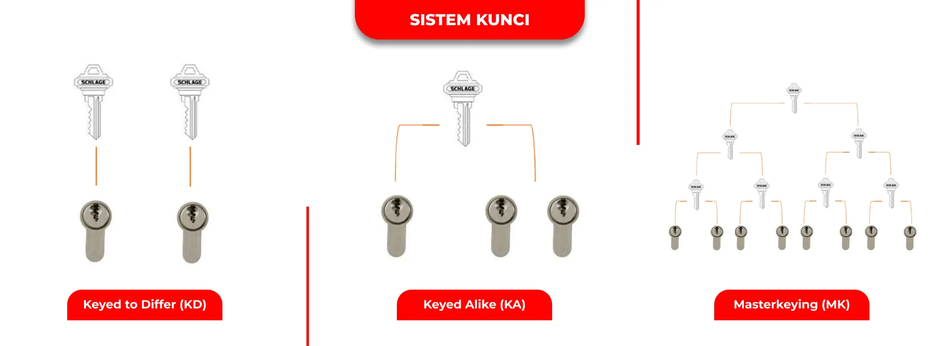 Selain memilih jenis cylinder dan ukurannya, kamu juga perlu memahami sistem penguncian yang digunakan, karena ini akan menentukan bagaimana akses antar pintu dikelola. Dalam sistem kunci Schlage dan banyak merek profesional lainnya, dikenal tiga jenis sistem utama: