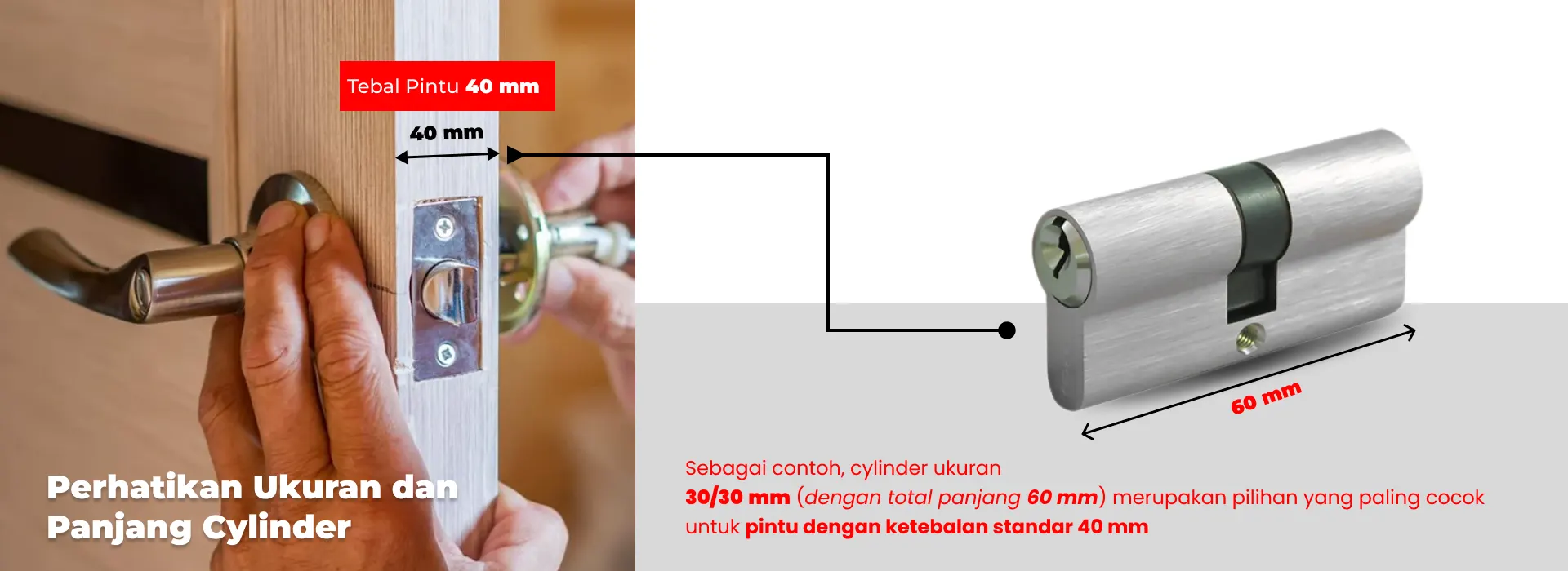 Ukuran cylinder biasanya ditulis dalam format dua angka, misalnya 60 (30/30) mm, yang menunjukkan panjang sisi kiri dan kanan dari tengah lubang kunci. Sesuaikan dengan ketebalan pintu dan posisi lubang cylinder agar tampilan rapi dan aman.